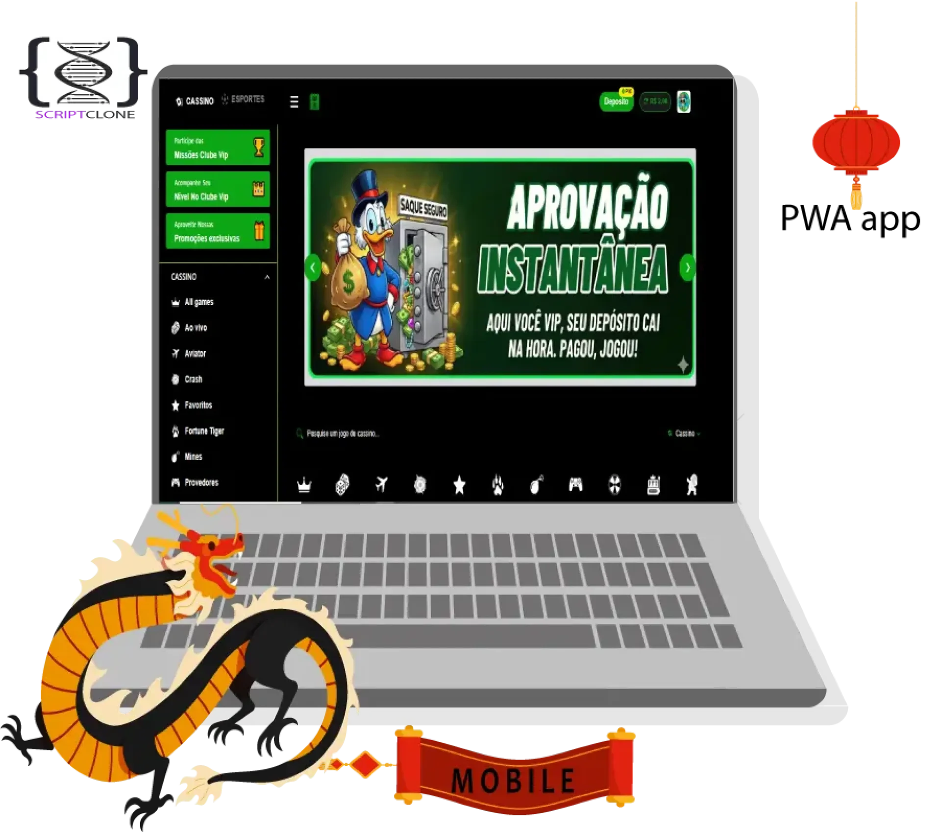 Desenvolvido com tecnologia Laravel, nosso Cassino Script PRO é a solução ideal para quem quer entrar no mercado de jogos online com alta lucratividade, pagamentos via PIX e integração com os melhores provedores de API.